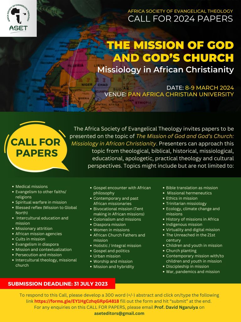 The Africa Society of Evangelical Theology invites papers to be presented on the topic of The Mission of God and God’s Church: Missiology in African Christianity. Presenters can approach this topic from theological, biblical, historical, missiological, educational, apologetic, practical theology, and cultural perspectives. See the poster below for more sub-themes and other details. For any clarification, you may email Prof. David Ngaruiya, on aseteditors@gmail.com