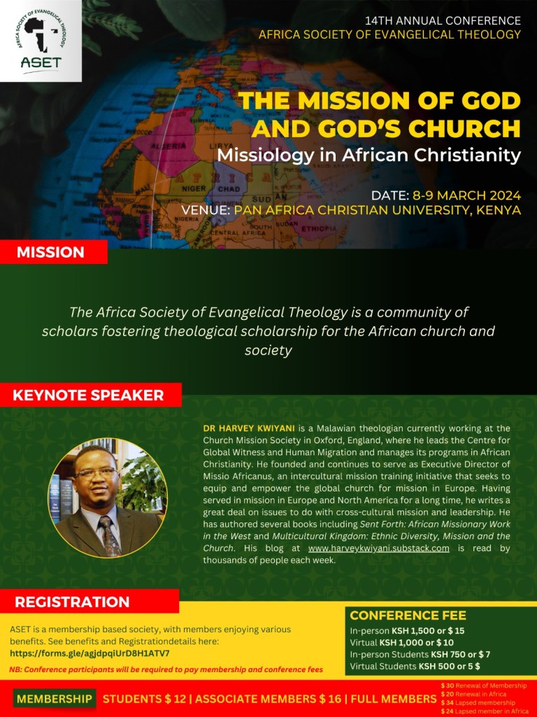 The 14th Annual Africa Society of Evangelical Theology (ASET) conference and AGM will be a hybrid conference held on March 8th to 9th at Pan Africa Christian University, Nairobi (Kasarani) Kenya.